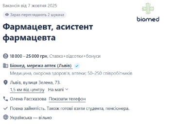 Также работа для пенсионеров во Львове найдется на должность фармацевта, которая оплачивается зарплатой в размере 18 – 25 тысяч гривен. График: дневные изменения с 8.00 до 20.00 2/2 или 3/3