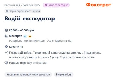 Також робота для пенсіонерів у Кривому Розі знайдеться на посаду водія-експедитора у мережу Фокстрот, яка оплачується зарплатою від 25 до 40 тисяч гривень.
