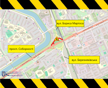 Зокрема, 29 та 30 жовтня, у період із 8:00 до 20:00, у Дніпровському районі столиці частково обмежено рух в Києві проспектом Соборності. Як зазначають у підприємстві, це необхідно для проведення поточного ремонту асфальтобетонного покриття. Роботи виконуватимуть на ділянці від з’їзду з вулиці Бориса Мартоса до проспекту Соборності.